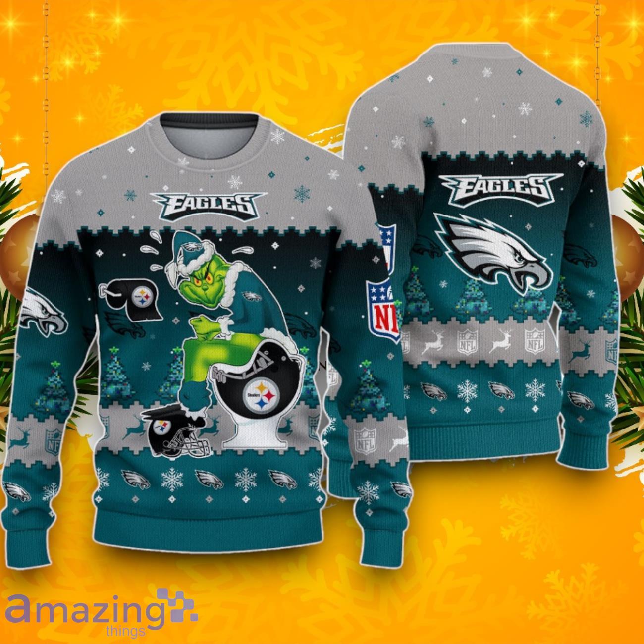Get ready to spread some holiday cheer with our Philadelphia Eagles Funny Grinch Toilet Ugly Christmas Sweater! Show off your love for the Eagles while adding a touch of humor to your festive wardrobe. This sweater features a hilarious design that combines everyone’s favorite holiday character, the Grinch, with a comical twist – a toilet!