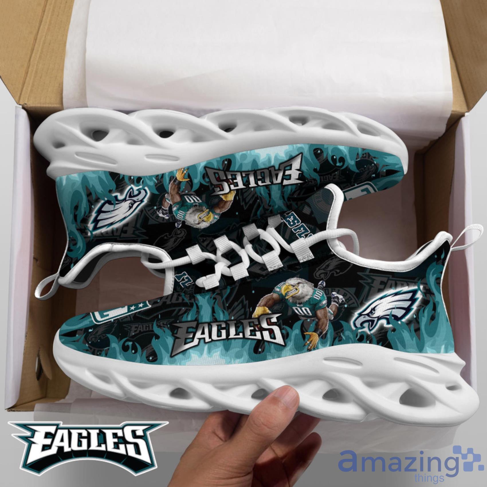 This Philadelphia Eagles NFL Fire Flame Pattern Max Soul Shoes Gift For Fans is a breathable, lightweight, and comfortable casual outdoor shoe that has a unique design. It is made of a mesh fabric which makes it sweat absorbent and breathable, while the rubber bottom ensures traction, comfort, and durability. It is available in two colors: black or white sole. There are two styles of shoelace holes so you can choose your preference.