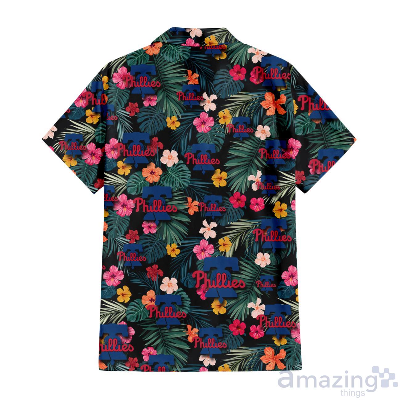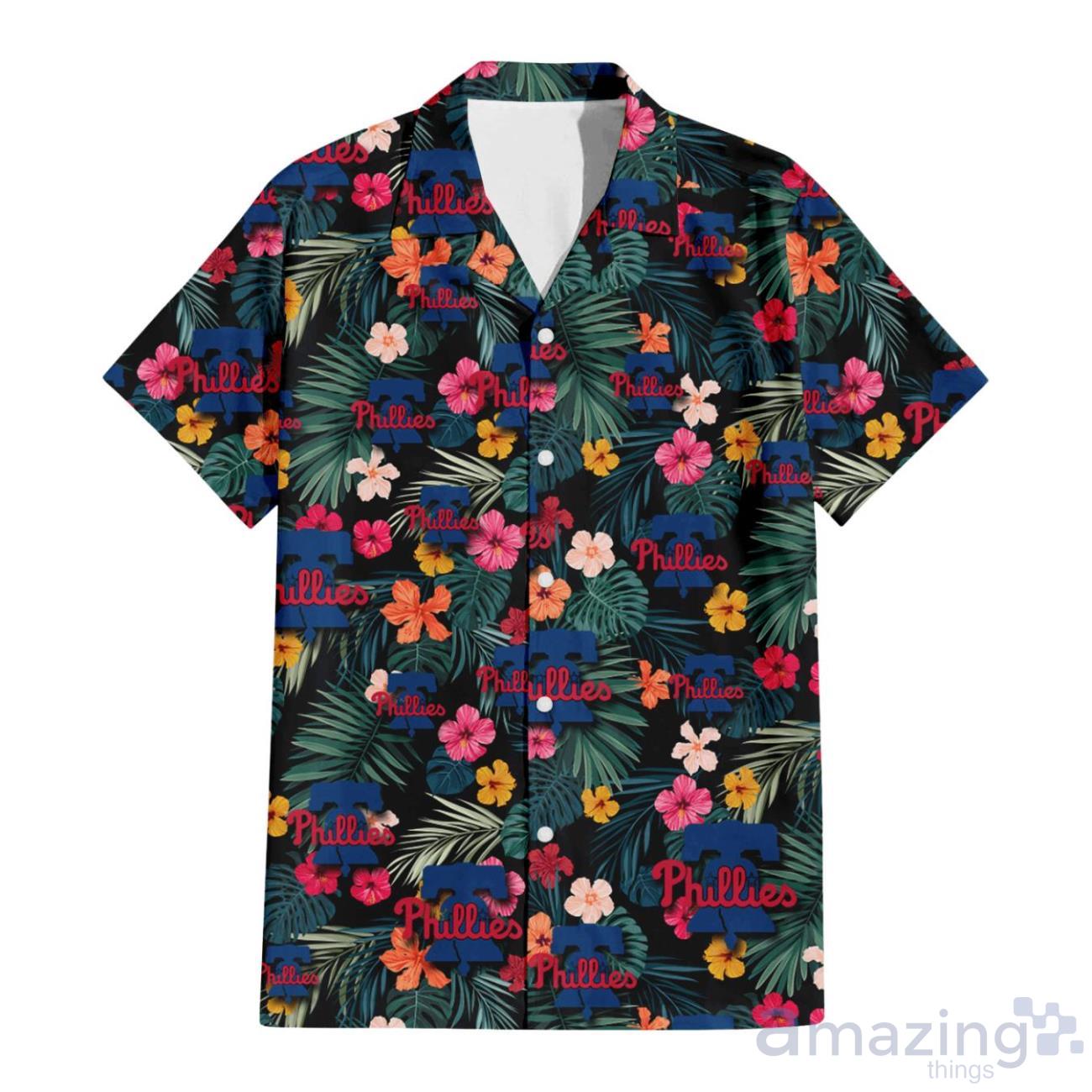 Some of the Philadelphia Phillies Pink Yellow Orange Hibiscus Big Tropical Leaf Black Background 3D Hawaiian Shirt Gift For Fans photos