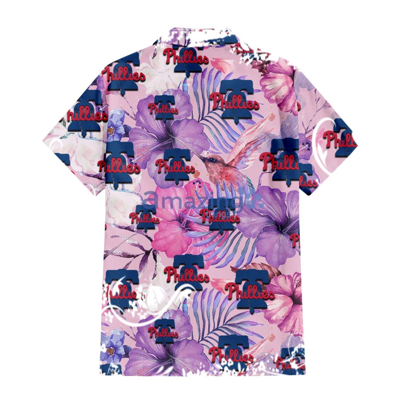 Philadelphia Phillies White Purple Hibiscus Pink Hummingbird Pink Background 3D Hawaiian Shirt Gift For Fans