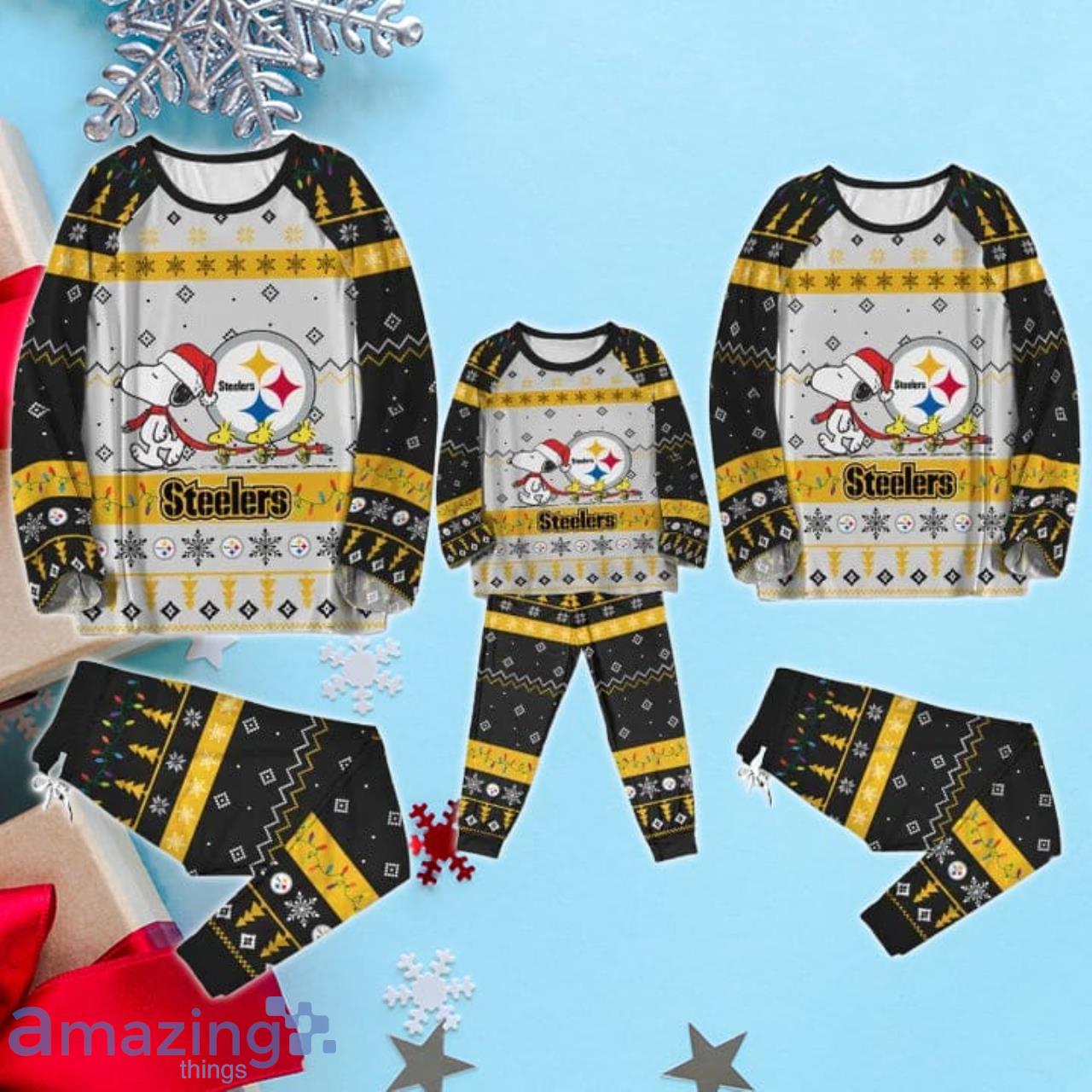 Not only are these pajamas incredibly comfortable, but they also make for a fantastic Christmas gift. Surprise your loved ones with this festive and practical present, and watch their faces light up with joy. Perfect for Steelers enthusiasts of all ages, our pajama set is an ideal way to spread holiday cheer and team spirit.