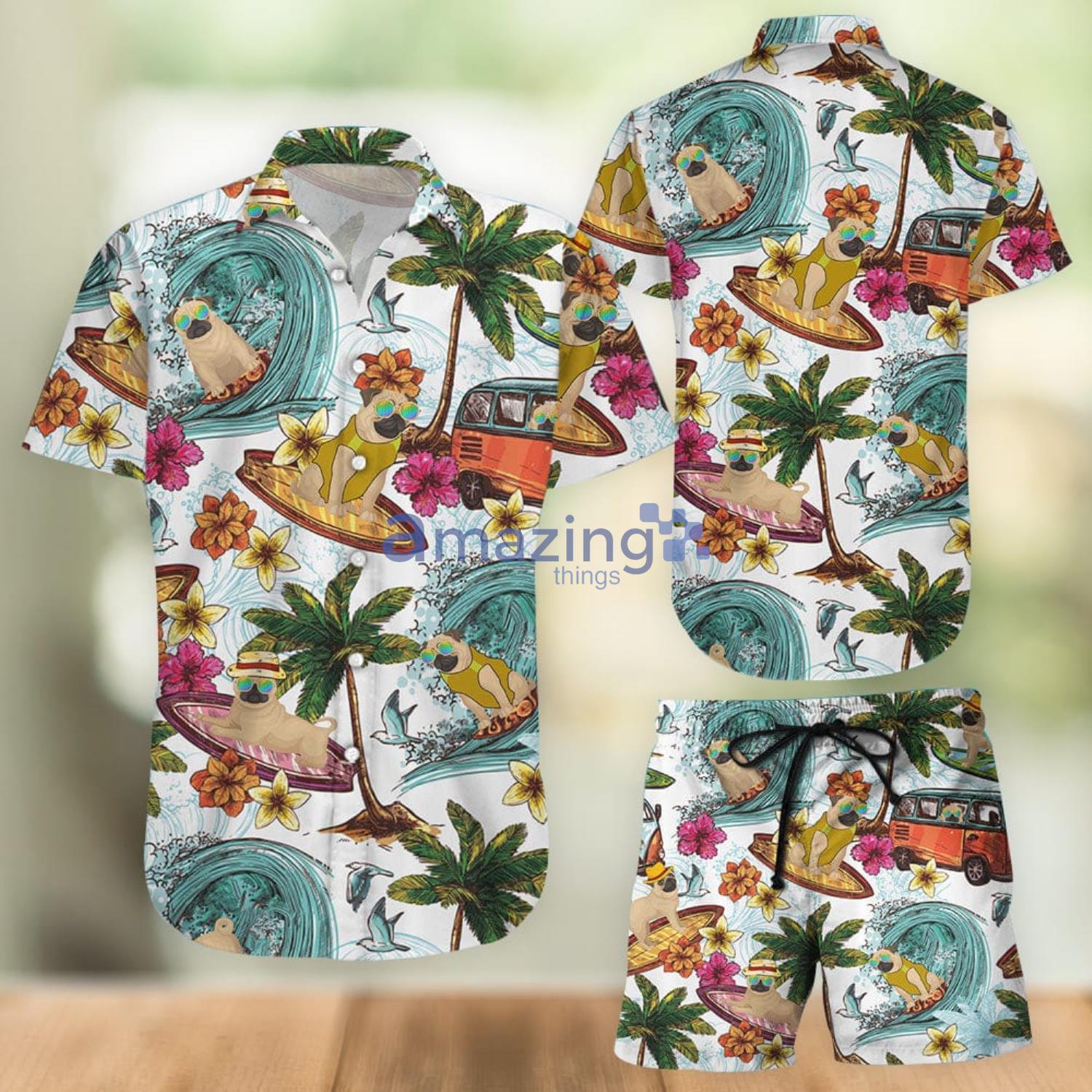 Pug In Hawaiian Shirt And Shorts Beach Hawaii Pugs Flower Button Down Shirt Surfing Gifts For Dad Details: