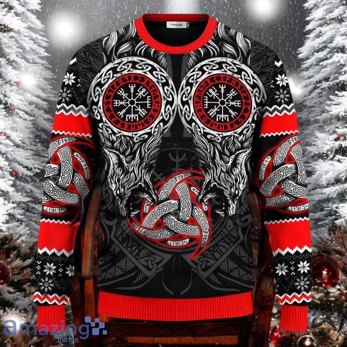 Red Triple Horn Pattern Wolf Viking Ugly Christmas Sweater Holiday Gift For Family and Friends