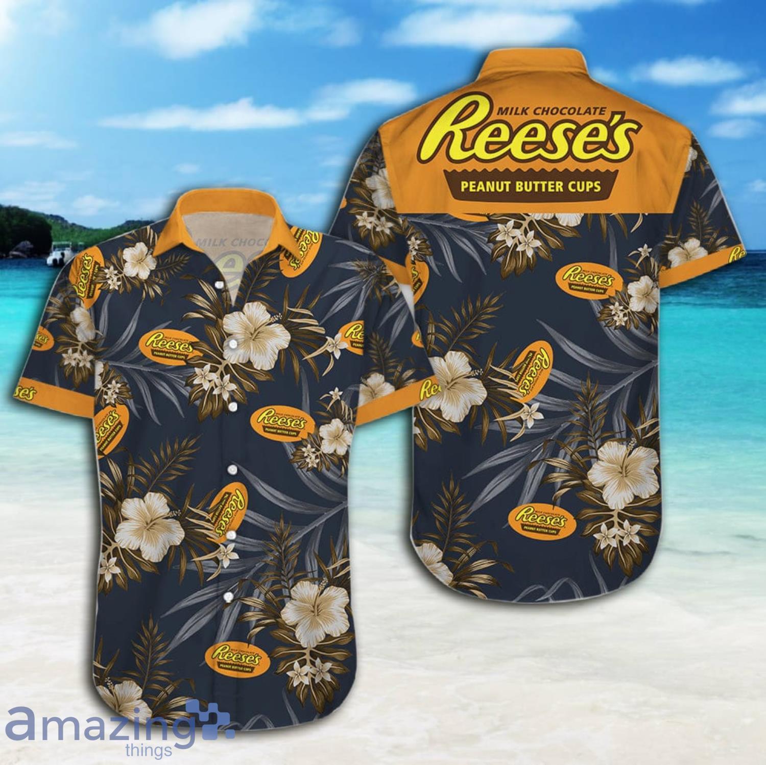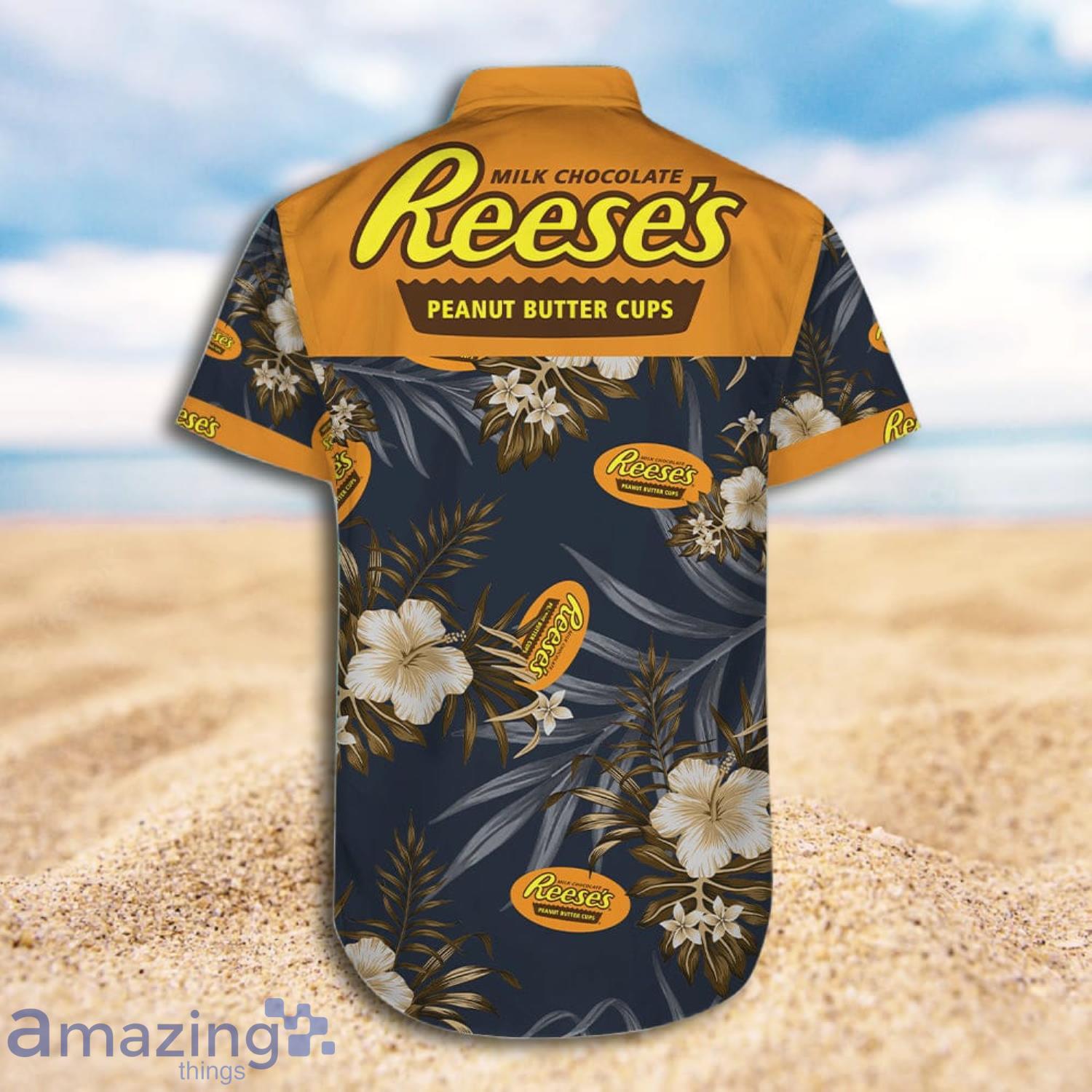This design is available in a combo Hawaiian shirt & shorts. You can also get it separate. The default option is only one shirt or one pair of shorts. You have chosen a combo to get them both. This combo Reeses Peanut Butter Cups Tropical Flowers Short Sleeve Hawaiian Shirt And Short is perfect to go to the beach. Get yours now or make a great gift.