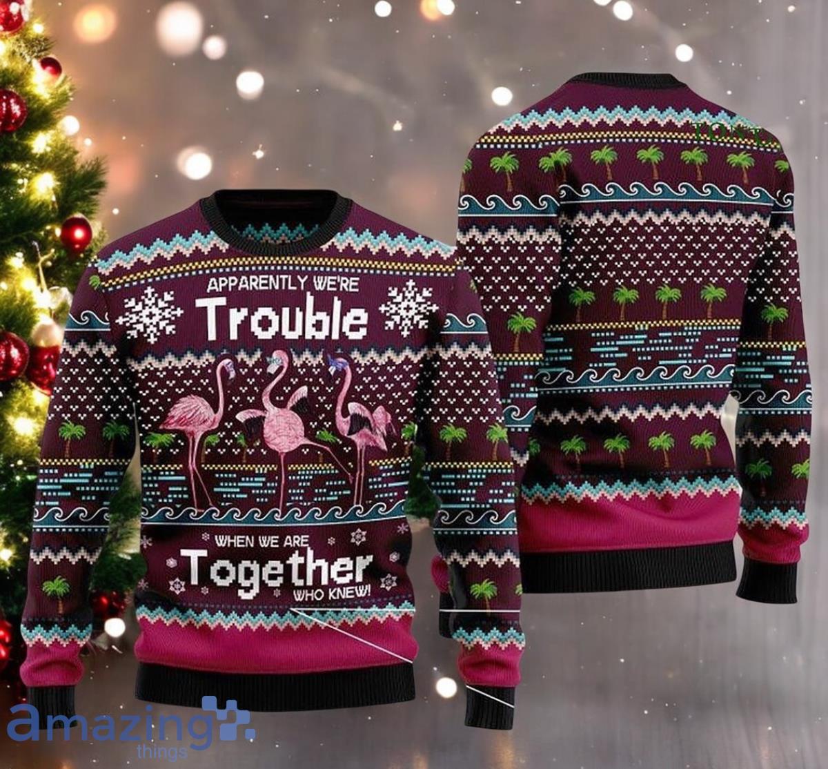 Get ready to spread some holiday cheer with our uniquely designed Retro Flamingo Christmas Ugly Sweater. This eye-catching sweater, aptly named “Trouble When We Are Together,” is perfect for adding a touch of playful festivity to your winter wardrobe. Stand out at your next holiday gathering with this conversation-starting piece that blends retro aesthetics with a whimsical Christmas theme.