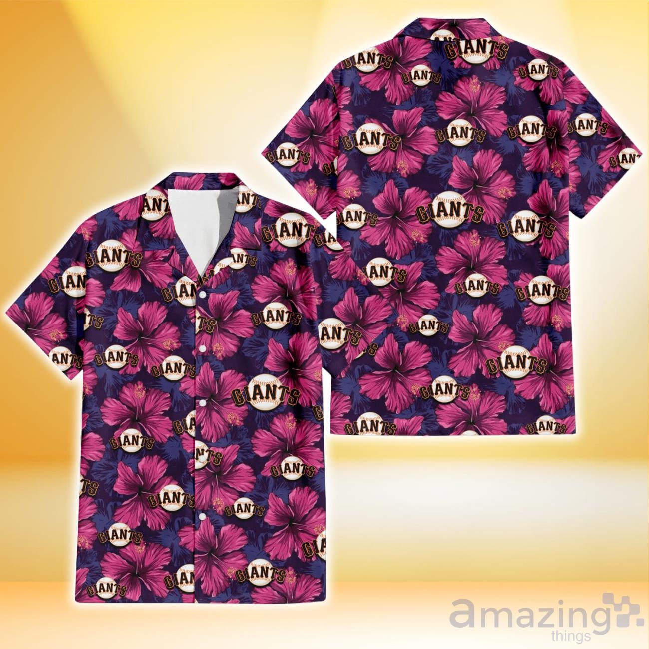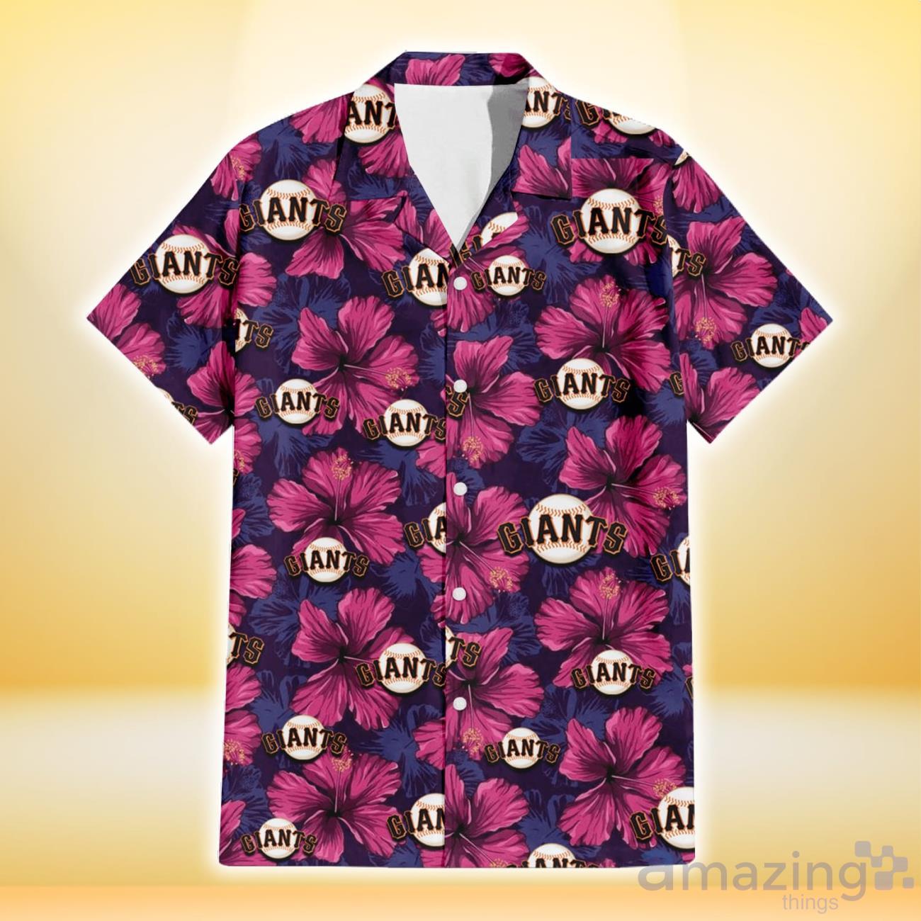 Some of the San Francisco Giants Plum Vilolet Hibiscus Dark Navy Leaf Black 3D Hawaiian Shirt Gift For Fans photos