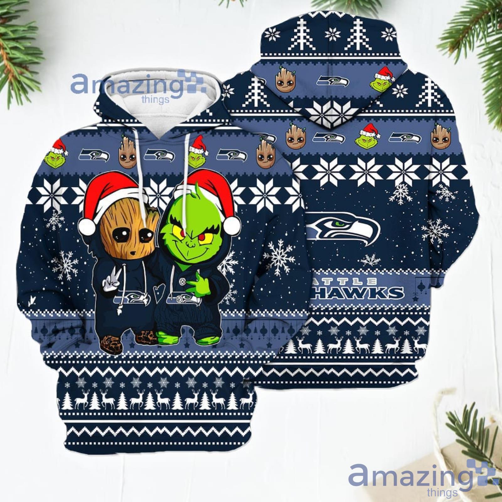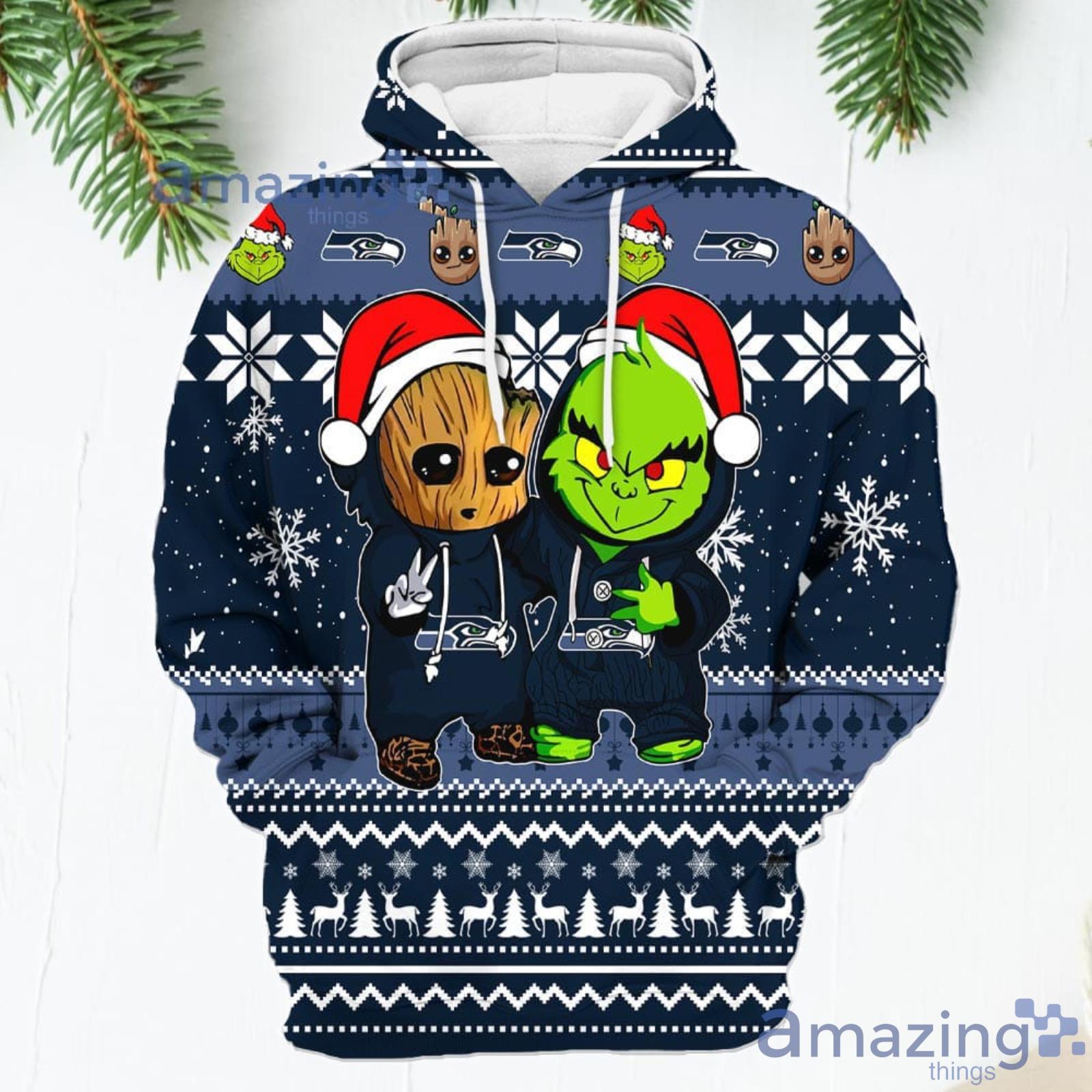 Seattle Seahawks Baby Groot And Grinch Best Friends New Trends Christmas Gift 3D Hoodie For Men And Women Information