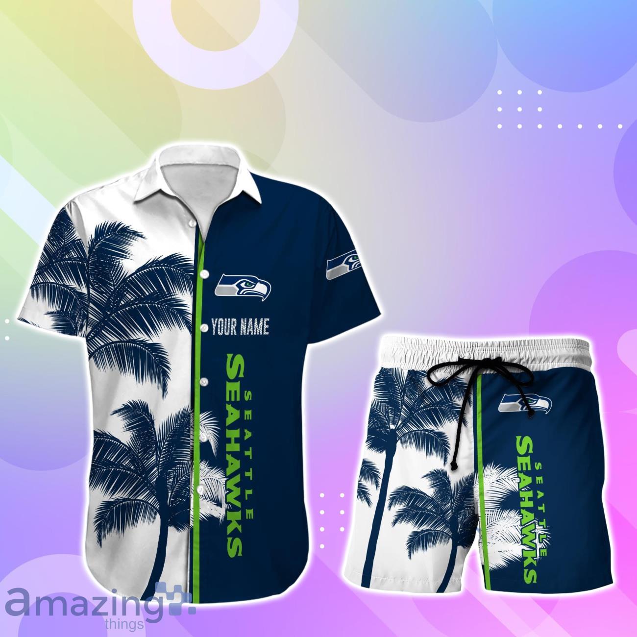Show off your love for the Seattle Seahawks in style with our custom Hawaiian shirt and shorts set featuring a fun palm tree design. Personalize it with your own name for a unique touch. Perfect for game days, beach outings, or simply lounging in comfort. Get ready to turn heads and stand out from the crowd with this vibrant and eye-catching ensemble. Order yours today and elevate your fan gear to a whole new level!