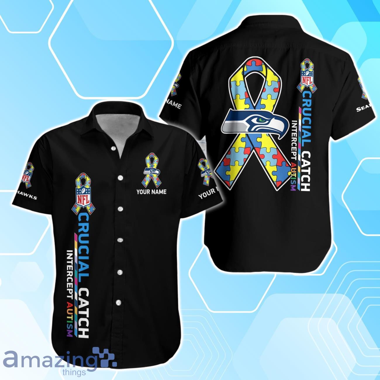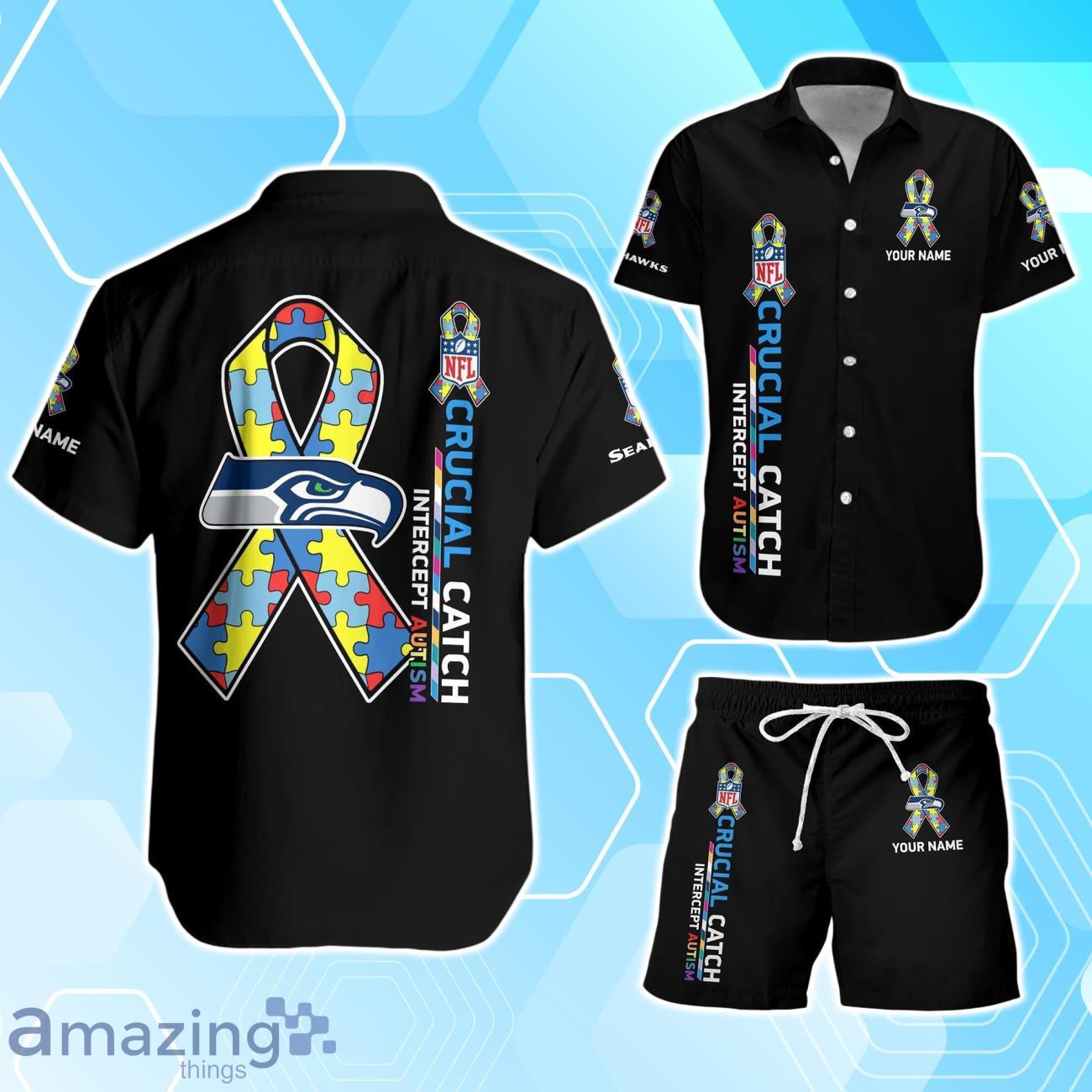 Introducing the Seattle Seahawks Hawaiian Shirt & Short Crucial Catch Intercept Autism Custom Name – a perfect blend of style, support, and personalization!