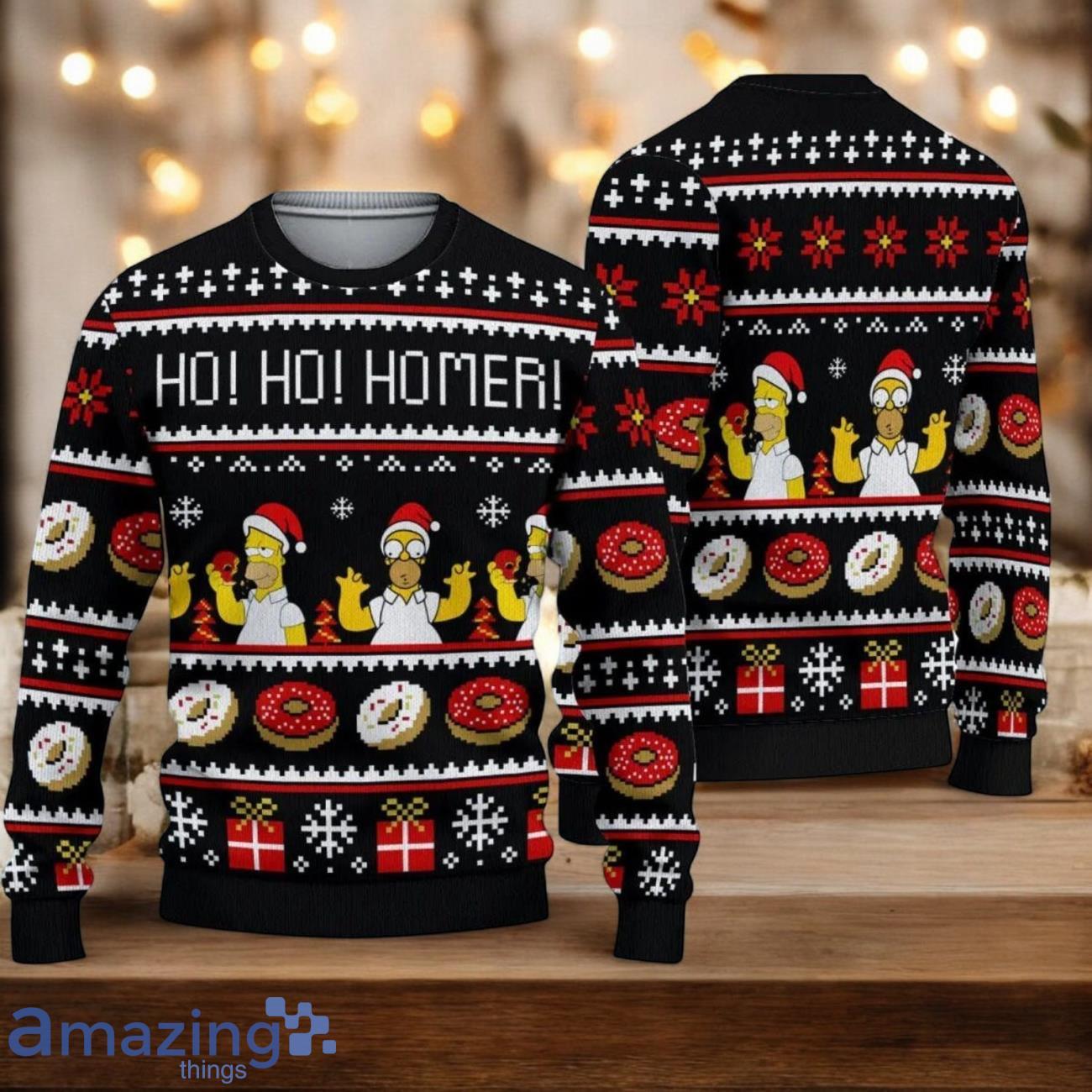 The Christmas sweater features a vibrant and playful design centered around Homer Simpson. Dominant colors include festive reds, greens, and whites, characteristic of traditional Christmas apparel. The composition showcases Homer in a humorous pose, likely incorporating elements of the show’s signature style. Expect a mix of patterns, textures, and possible 3D elements to enhance the “ugly” yet appealing nature of the design, ensuring this novelty sweater stands out from the crowd. The Ho Ho Homer theme adds an extra layer of Christmas cheer, making it ideal for festive occasions.