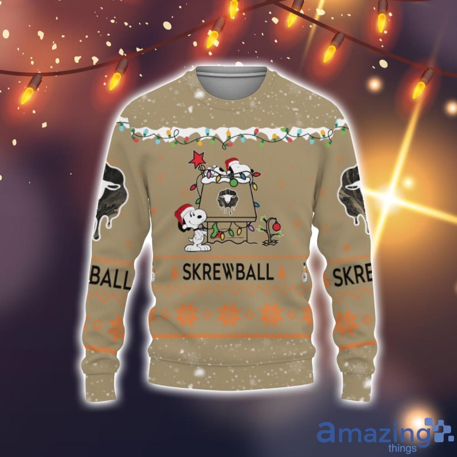 Featuring an eye-catching design that combines the iconic Snoopy House with the beloved Skrewball Whiskey logo, this sweater is a must-have for any whiskey lover or Snoopy fan. The cute and playful combination of these two elements creates a unique and memorable look that will surely turn heads at any holiday gathering.