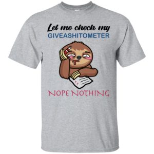 The charm of this shirt lies in its straightforward, yet brilliantly funny message. The phrase “Let Me Check My Giveashitometer… Nope Nothing” is a universally understood expression of apathy or a complete lack of concern for trivial matters or unnecessary drama. Coupled with the image of a sloth, an animal synonymous with taking things slow and being generally unbothered, the message resonates deeply with those who appreciate humor and aren’t afraid to show their less-than-enthusiastic side when warranted.