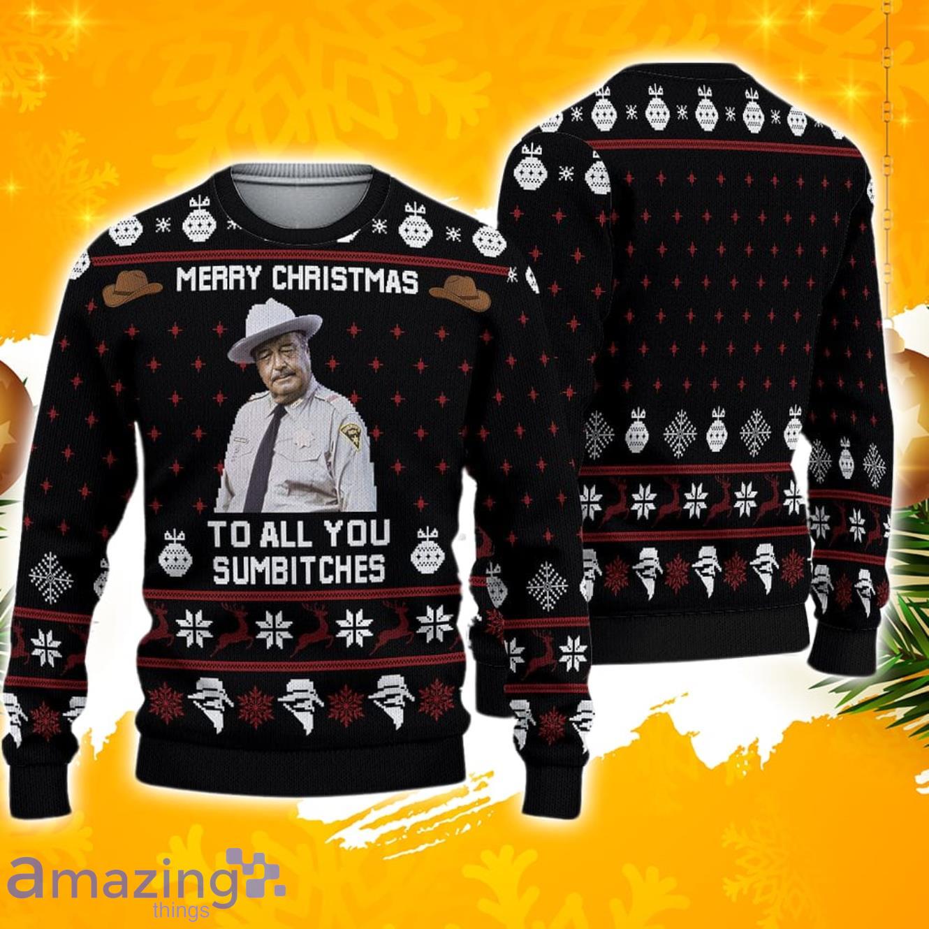 Get ready to spread some holiday cheer with our Smokey And The Bandit Merry Christmas To All You Sumbitches Ugly Sweater! This festive garment is perfect for those who want to make a bold statement at any holiday gathering.