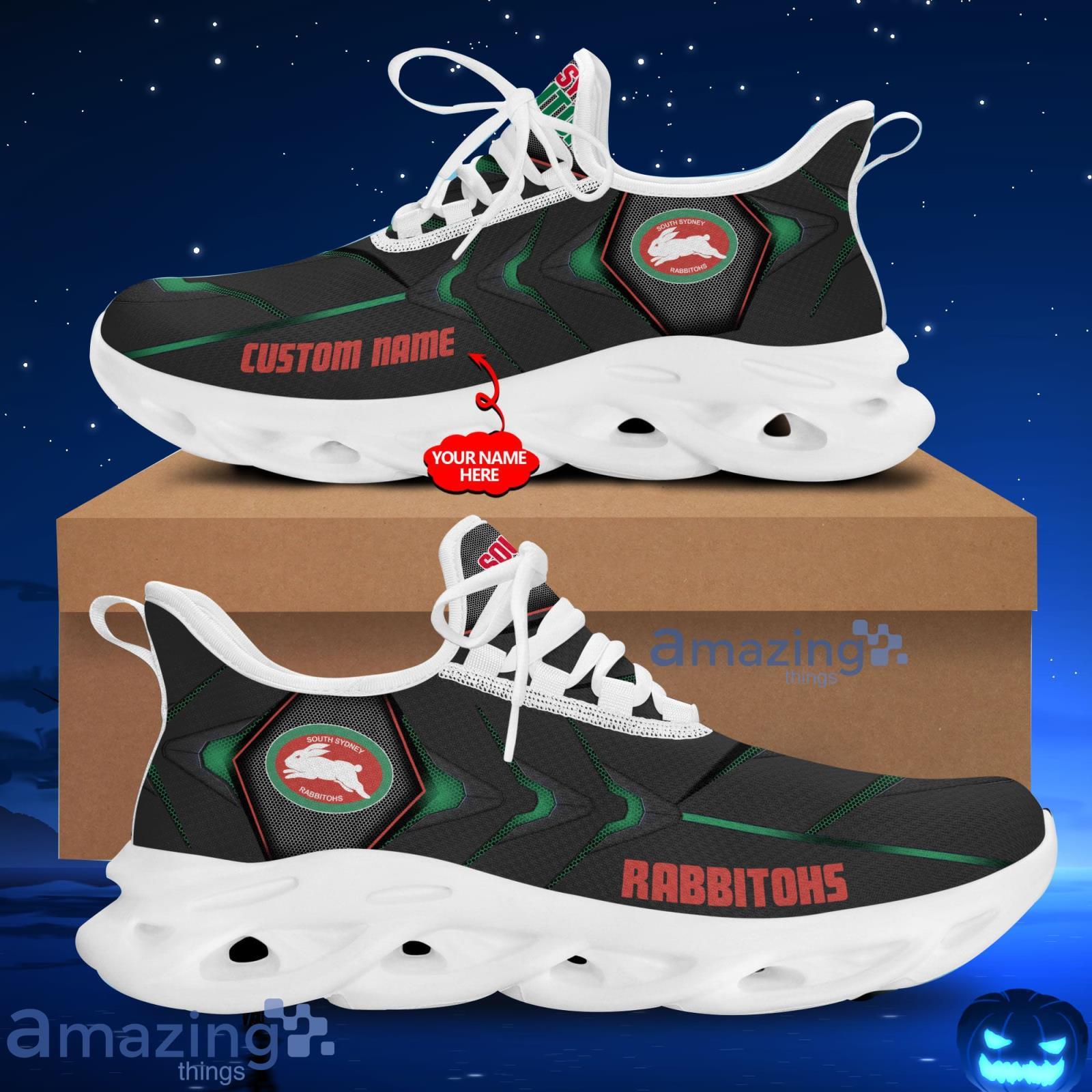 This South Sydney Rabbitohs NRL Running Sneakers Men And Women Max Soul Shoes is a breathable, lightweight, and comfortable casual outdoor shoe that has a unique design. It is made of a mesh fabric which makes it sweat absorbent and breathable, while the rubber bottom ensures traction, comfort, and durability. It is available in two colors: black or white sole. There are two styles of shoelace holes so you can choose your preference.