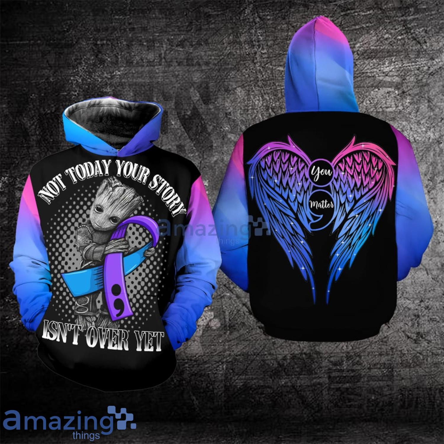 Whether you’re wearing it to raise awareness, to show support for loved ones or simply as a fashion statement, the Suicide Awareness Not Today Your Story Isn’t Over Yet Baby Groot All Over Print 3D Hoodie is an excellent choice. So why wait? Get yours today and make a bold statement while staying cozy and comfortable.