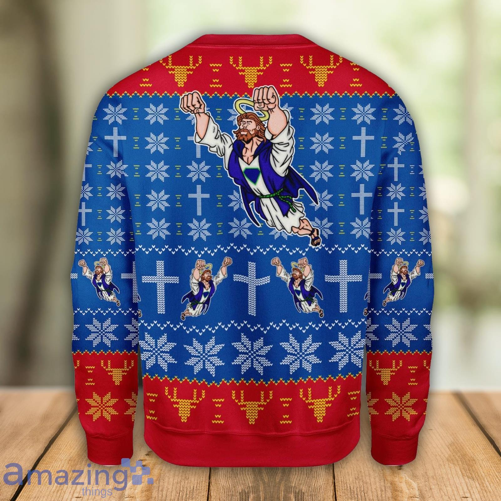 Featuring a unique design that combines the iconic figure of Jesus with a playful twist, this sweater is sure to turn heads at any holiday gathering. The vibrant colors and intricate details make it a standout piece that will add a touch of fun to your Christmas wardrobe.