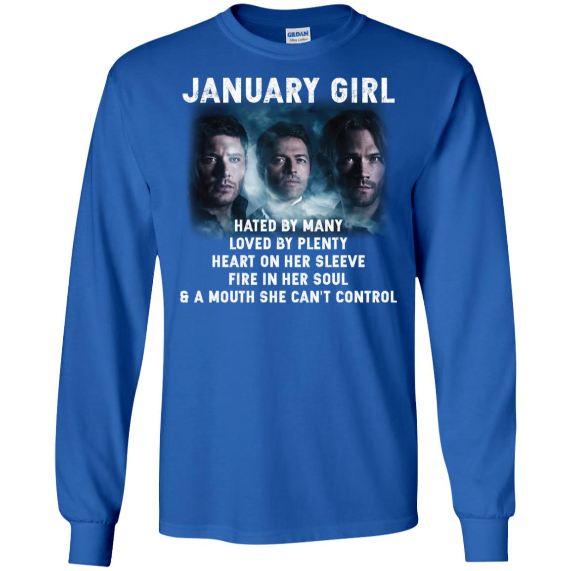 The powerful design of the Supernatural January Girl Hated By Many Loved By Plenty Heart On Her Sleeve Fire In Her Soul & A Mouth She Can’t Control Shirt is available across various apparel types to suit your preference and the season. You can find this striking design available in: