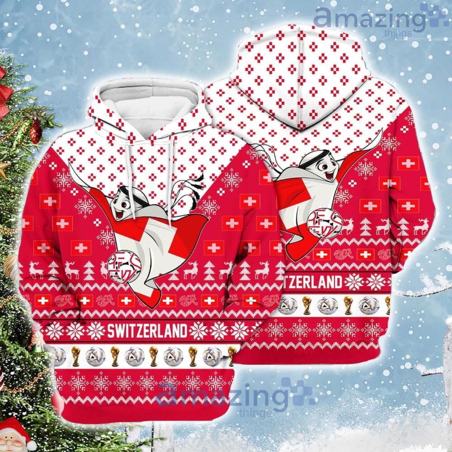 Perfect design for holiday. Get yours this shirt or this is a cute item for your daddy, gift for your mom, and gift for friends on any occasion. buy a cute Switzerland Sweater Mascot Qatar Soccer Team World Cup 2022 Qatar Champions Mascot Gift All Over Printed 3D Shirt now.