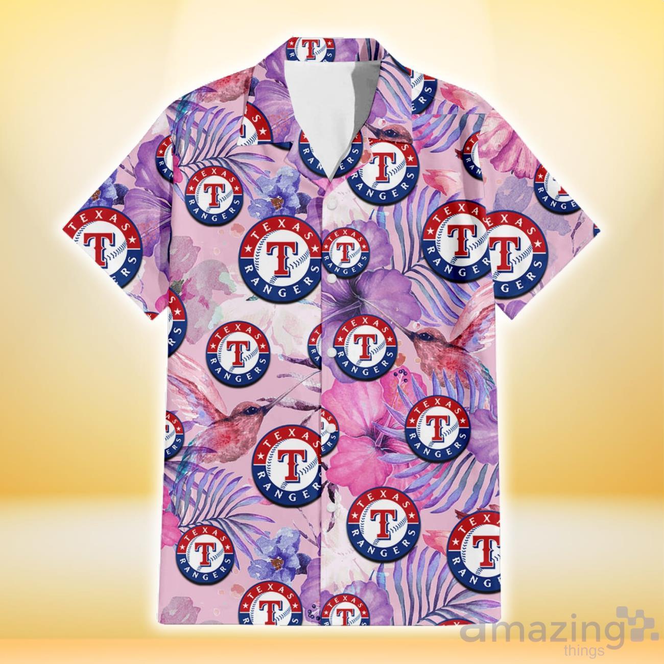 Some of the Texas Rangers White Purple Hibiscus Pink Hummingbird Pink Background 3D Hawaiian Shirt Gift For Fans photos