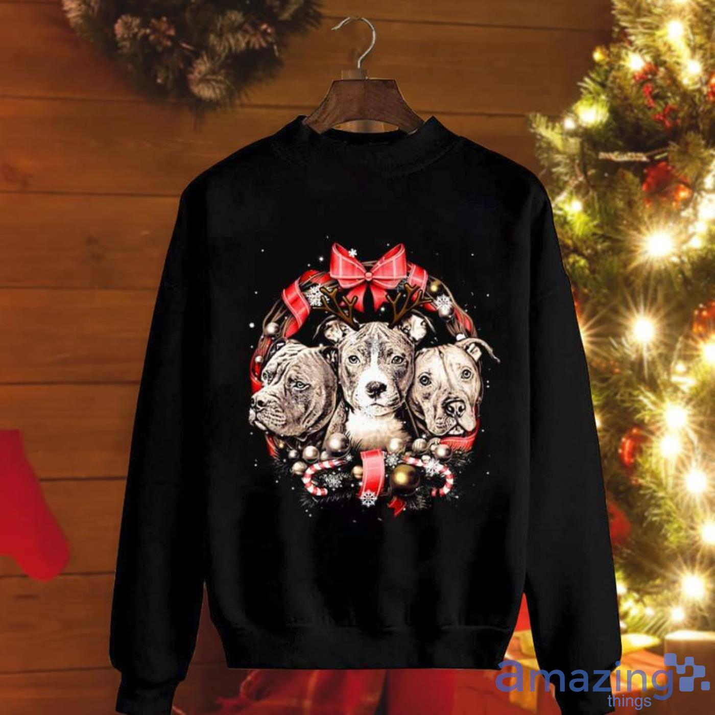 Three Pitbull Wreath Christmas With Candy Cane Christmas Sweatshirt Details