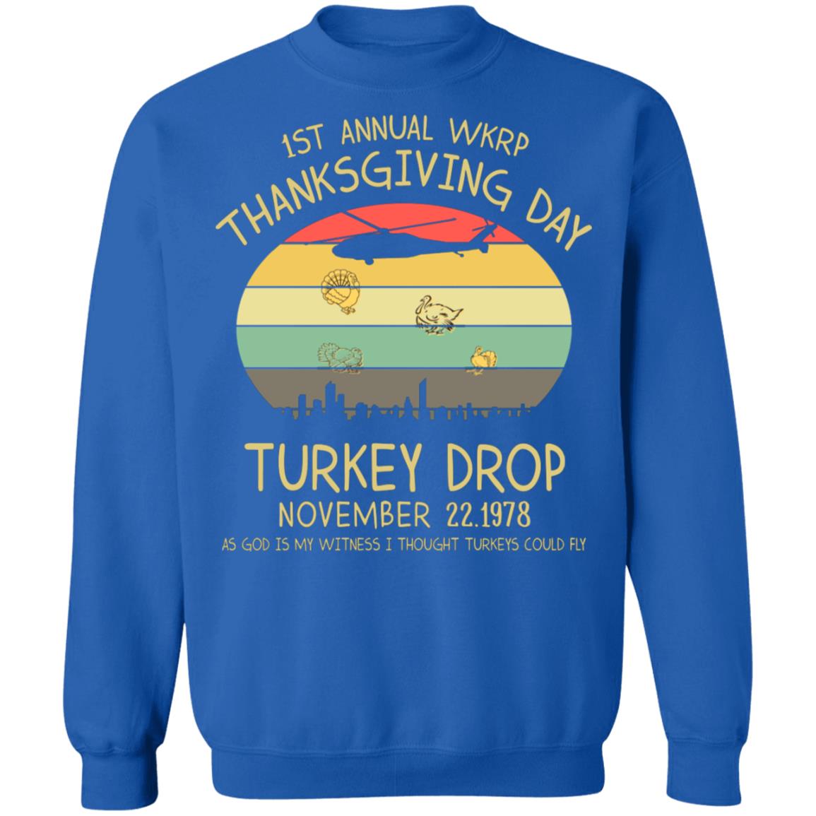 Whether you’re buying it for yourself to wear on Thanksgiving Day or gifting it to a friend or family member, this 1st Annual WKRP Turkey Drop commemorative shirt is sure to be a hit. It’s a fun, comfortable, and nostalgic way to remember the day turkeys (briefly) soared.