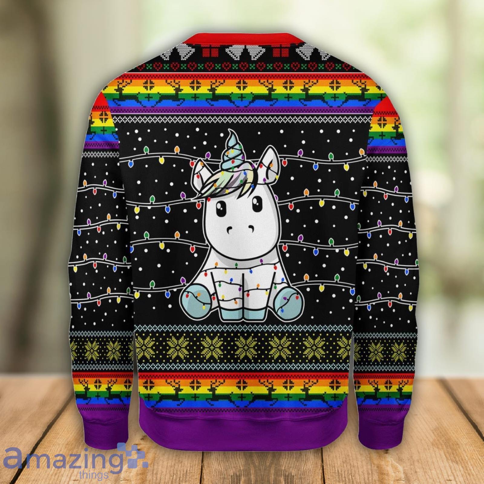 Featuring a delightful unicorn prancing amidst a beautifully adorned Christmas tree, this sweater is a unique blend of mythical charm and yuletide magic. The vibrant colors and intricate detailing make it a visually stunning piece that is sure to turn heads at any holiday gathering or ugly Christmas sweater party.