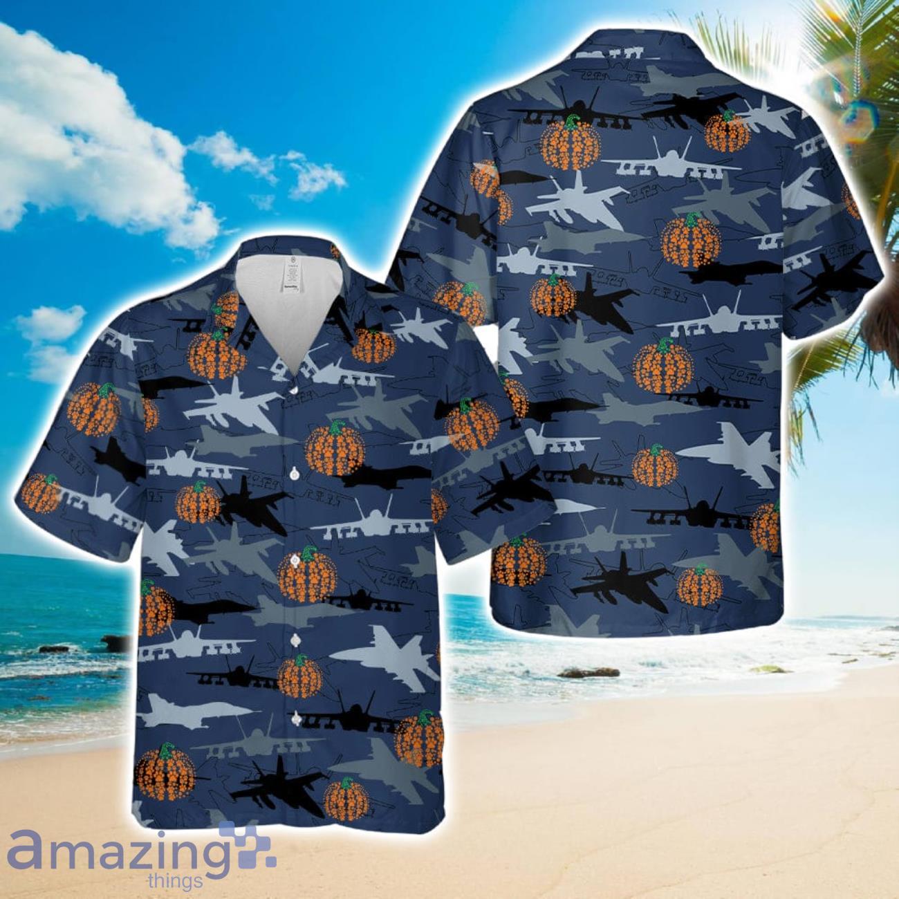 US Navy McDonnell Douglas FA-18 Hornet Silhouettes Pumpkin Hawaiian Shirt US Navy Summer Beach Shirt Details: