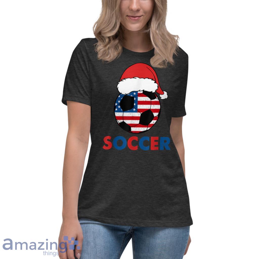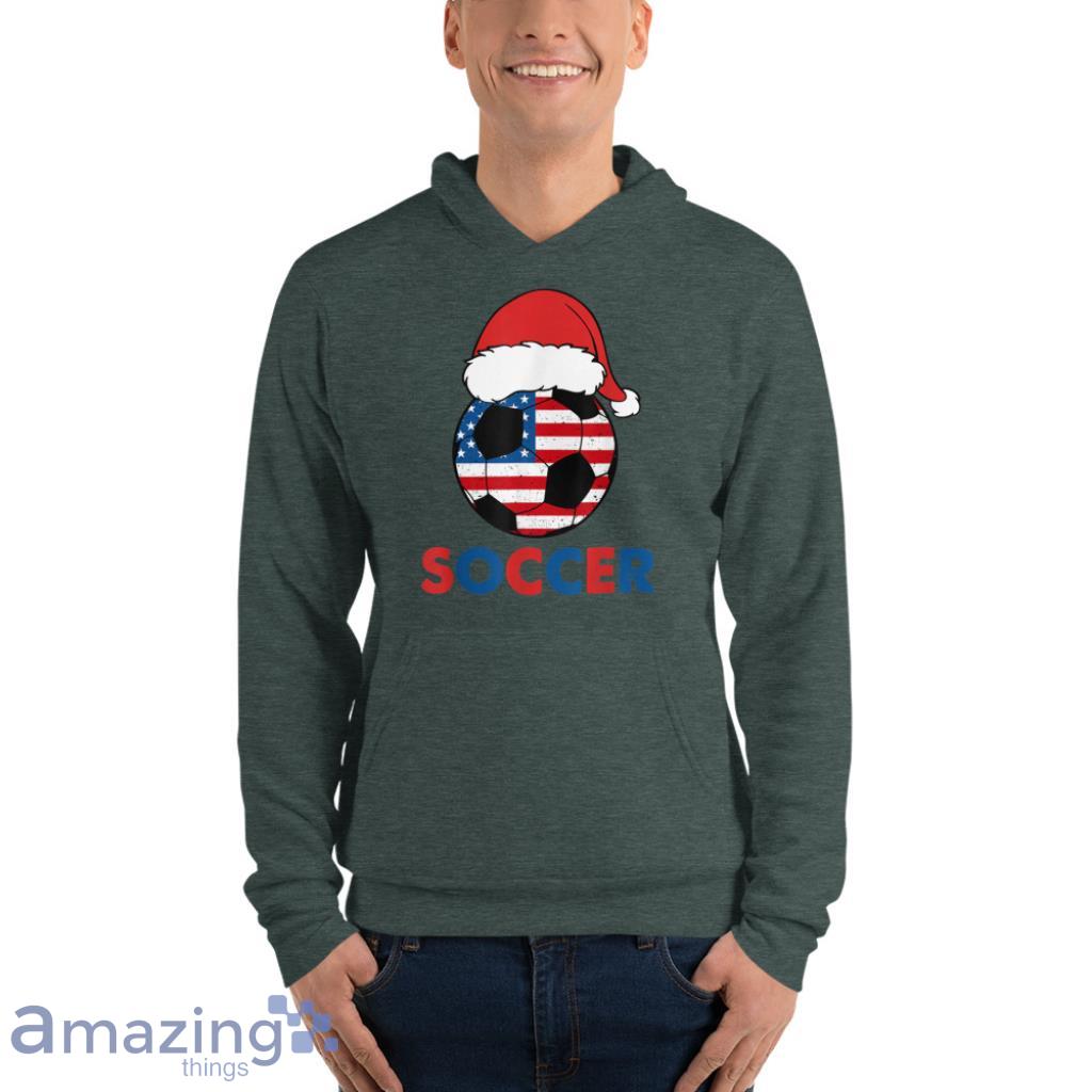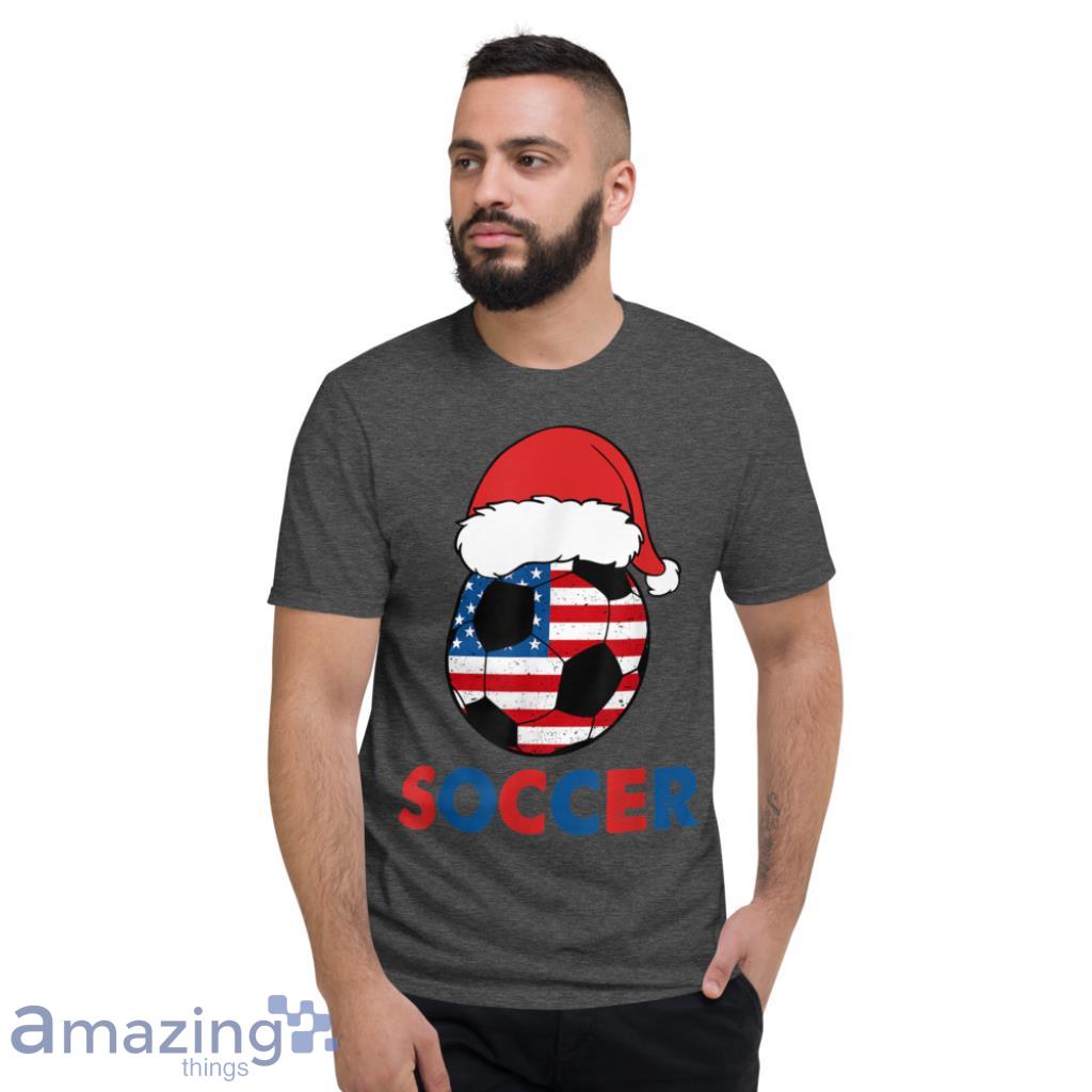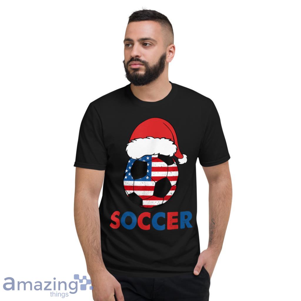 Introducing the USA Flag Hat Santa For Soccer Lover Christmas T-Shirt! This shirt is perfect for any soccer lover who also happens to love Christmas! The shirt features a Santa Claus hat with the American flag on it, making it perfect for showing your patriotic side during the holiday season! The shirt is made of 100% cotton, making it comfortable to wear, and is machine washable for easy care. Order yours today and be ready to show your holiday spirit on the soccer field!