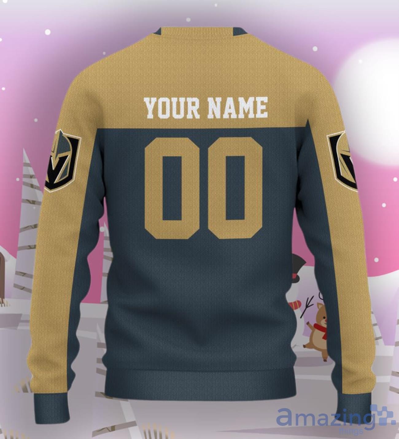 Crafted with attention to detail, this custom sweater features the iconic Vegas Golden Knights logo proudly displayed on the front. But what makes it truly special is the ability to personalize it with your own name and number, giving you a one-of-a-kind piece to flaunt at holiday parties or game nights.