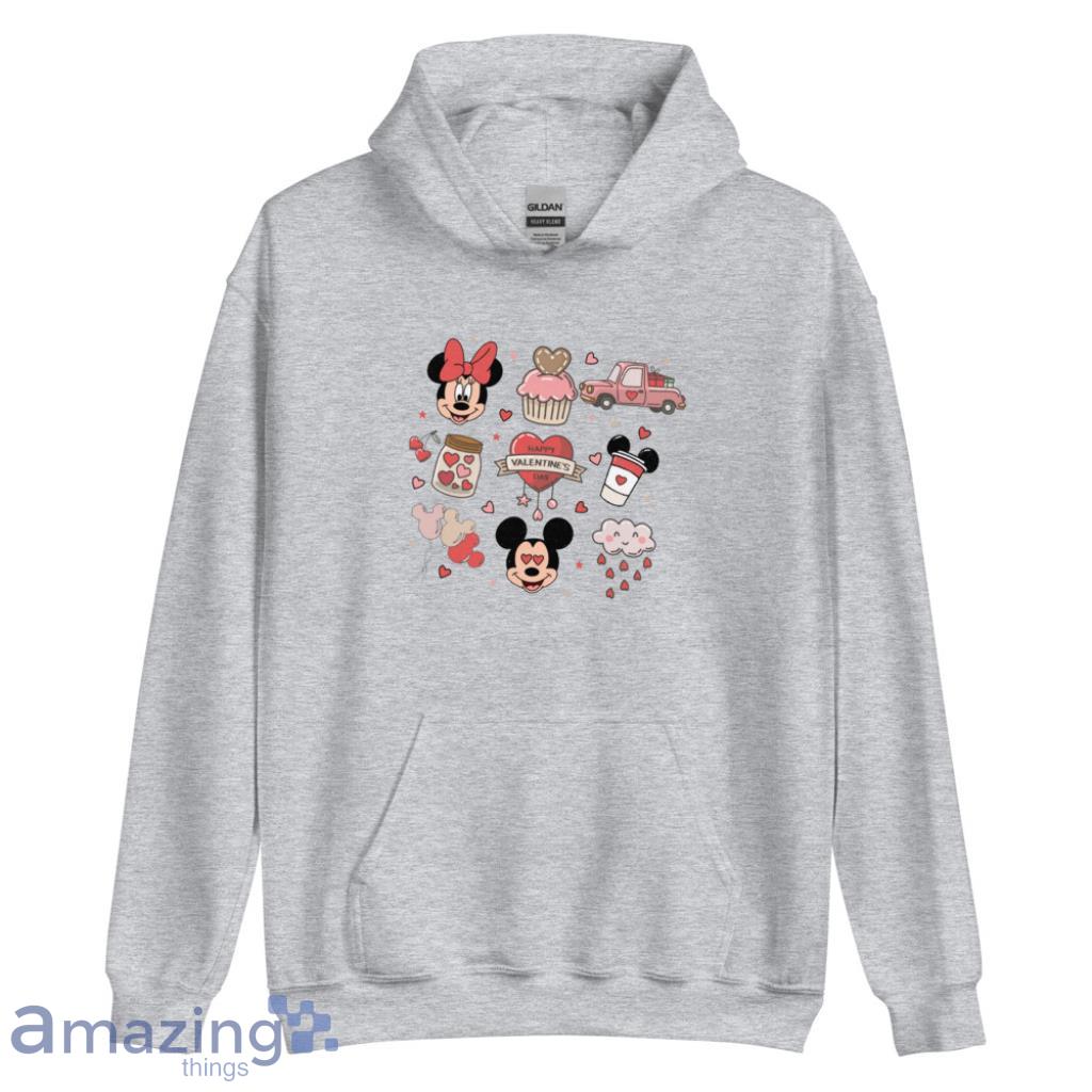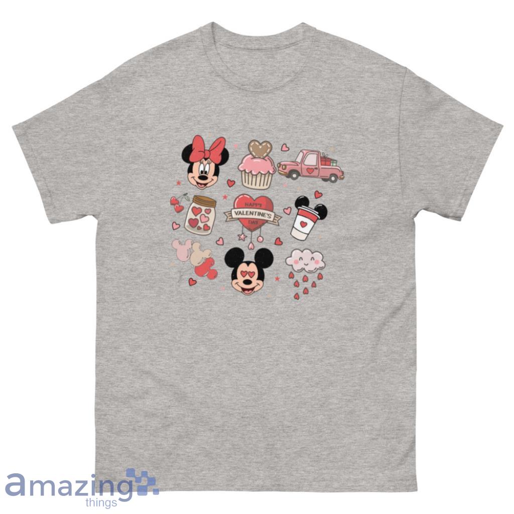 This shirt is the perfect way to show your love for Mickey and Minnie this Valentine’s Day! The shirt is red with a black and white image of Mickey and Minnie kissing on the front. The back of the shirt is black with a red heart. The shirt is made of 100% cotton and is machine washable.