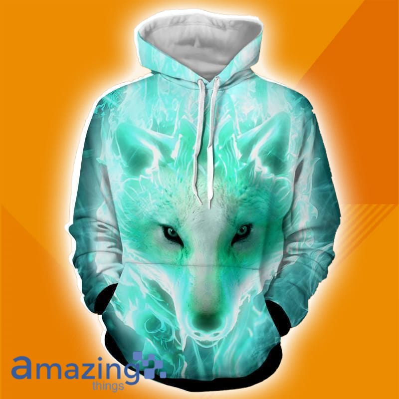 Explore the Striking White Wolf Lighting Cyan Blue Shades Vibrant All Over Print 3D Hoodie