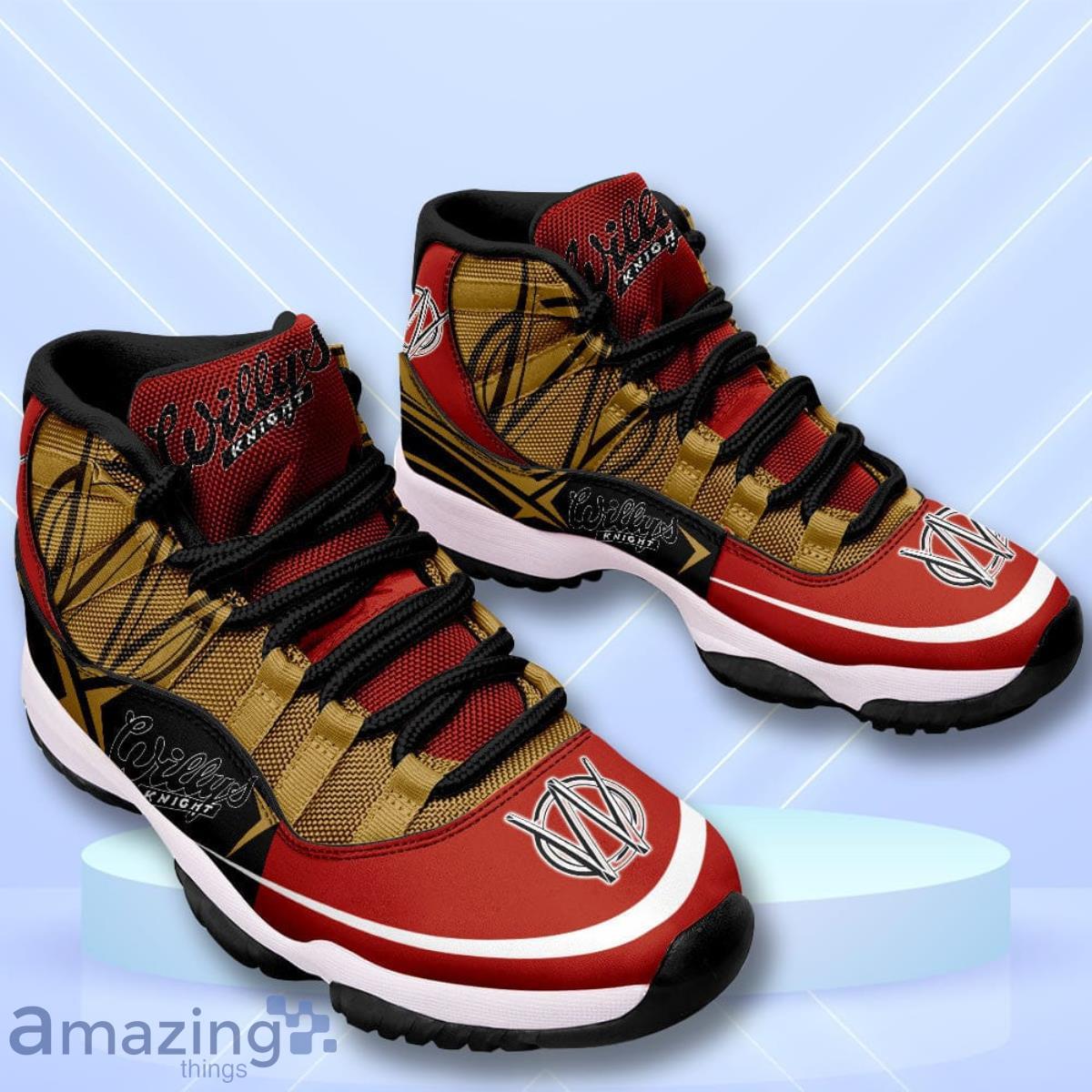 Crafted with meticulous attention to detail, these custom name sneakers exude an aura of exclusivity and individuality. The Air Jordan 11 silhouette, known for its sleek lines and distinct patent leather overlays, is elevated to a whole new level of uniqueness with the addition of the Willys Knight motif. The fusion of these two iconic brands creates an extraordinary masterpiece that effortlessly merges past and present.