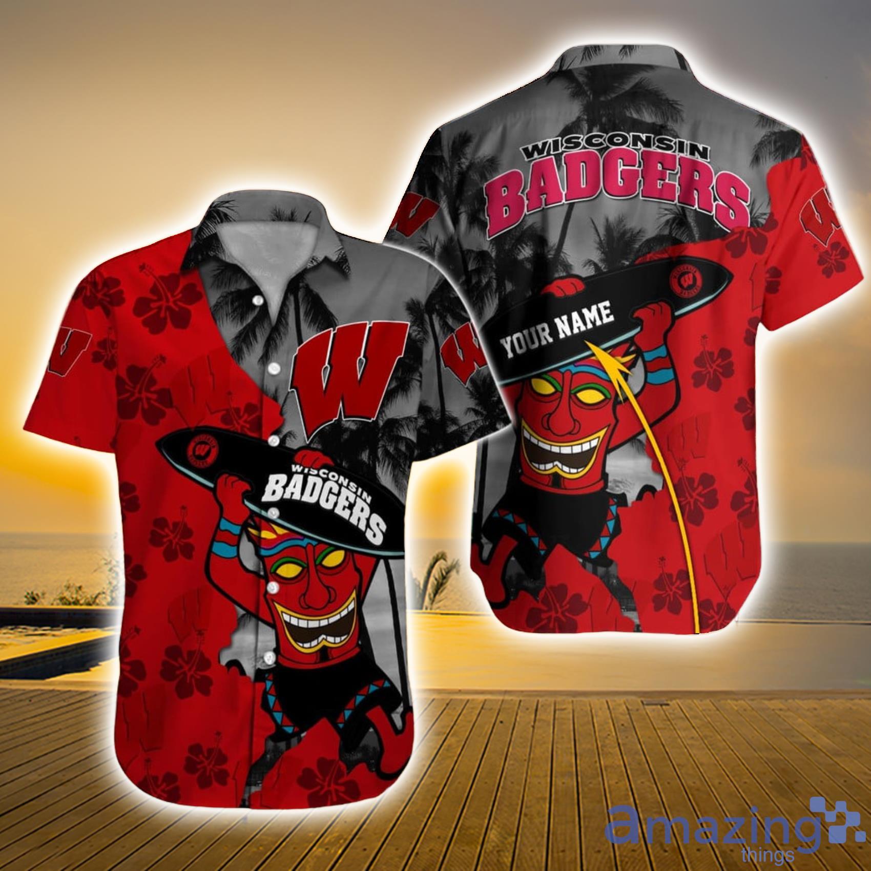 Looking for a way to show your love for the Wisconsin Badgers while also embracing the laid-back spirit of a Hawaiian summer? Look no further than our Wisconsin Badgers NCAA Custom Name Funny Surfing Habicus Coconut Tree Aloha Summer Hawaiian Shirt!