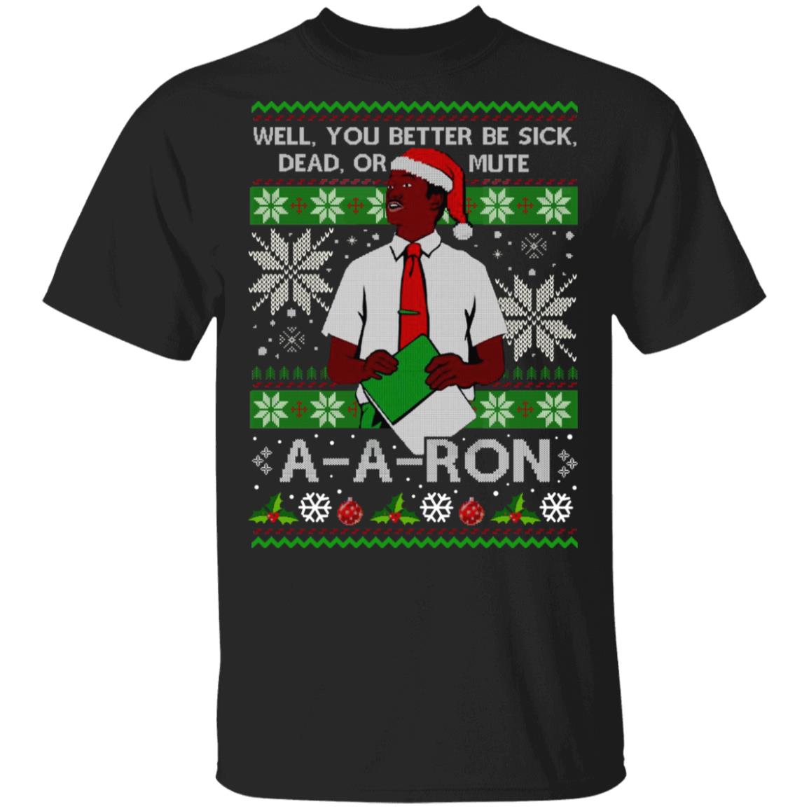 Opting for the You Better Sick Dead Or Mute A-a-ron Ugly Christmas Shirt brings several advantages:* Uniqueness: Stand out from the crowd of generic holiday apparel with a design that’s both festive and funny.* Conversation Starter: This shirt is guaranteed to spark conversations and bring laughs at any holiday event.* Ideal for Parties: Perfect for “ugly Christmas sweater” parties, offering a fresh and humorous alternative to traditional knitwear.* Memorable Gift: Provides a creative and unexpected gift that recipients are unlikely to already own.